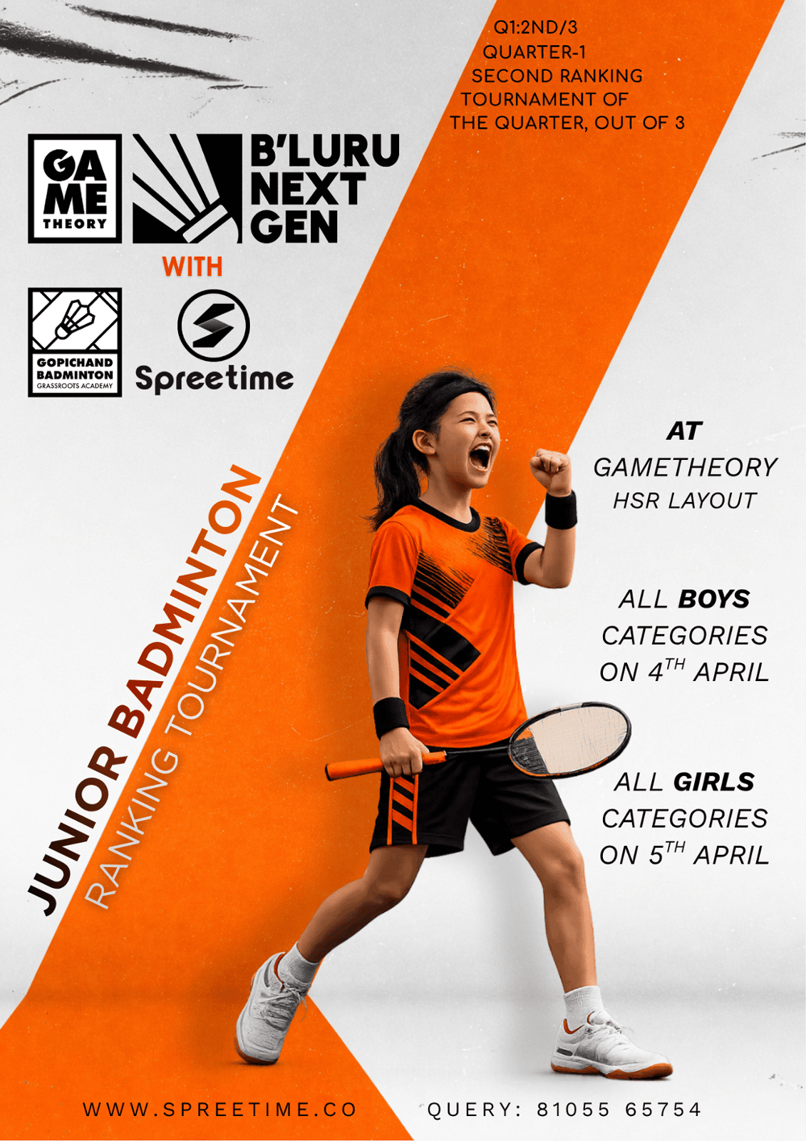 SCHEDULE: Boys (4th, APRIL)1. Under 9 - (Birth Year 2017) - 8.30 AM2. Under 11 - (Birth Year 2015) - 11.30 AM3. Under 13 - (Birth Year 2013) - 2.00 PM4. Under 15 - (Birth Year 2011) - 5.00 PMSCHEDULE: Girls (5th, APRIL)1. Under 9 - (Birth Year 2017) - 8.30 AM2. Under 11 - (Birth Year 2015) - 11.30 AM3. Under 13 - (Birth Year 2013) - 2.00 PM4. Under 15 - (Birth Year 2011) - 4.00 PMOnly FIRST 24 REGISTRATION in each categories are allowed. (FCFS)BENEFITS 🏸✨1. RANKING of the Player will be updated LIVE.2. Qualifier & Knock Out Format3. Compete against opponents from more than 200+ academies.4. Intense Competition, Fun & Entertainment