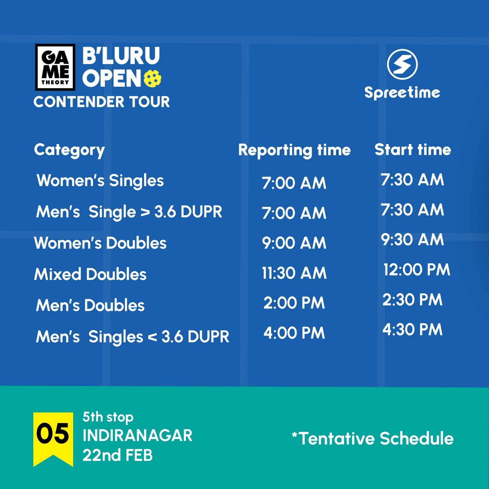 TOURNAMENT FORMAT ✨1. Open, Swiss System.2. Guaranteed 4 skill mapped matches for each team, subject to format adjustments3. Winners will keep facing harder opponents while losing means you will face a more appropriate opponent4.Standard rally scoring (to 11), subject to format adjustments5. Witness paperless Tournament6. This Fresh Year Kick Start with Pride of Rank.7. Ranking of the players and Scores are updated live on the screensPARTICIPATIONELIGIBILITY: Open to all skill levelsREGISTRATION: First-come-first-serve basis