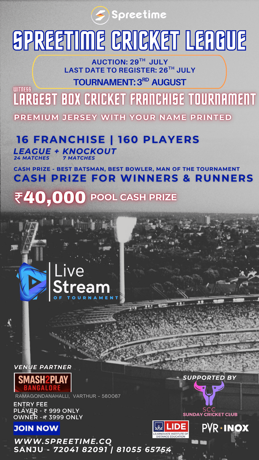 🔥 Spreetime Cricket League is here, and it's not just another box cricket tourney – it’s THE BIGGEST FRANCHISE BOX CRICKET SHOWDOWN in namma Bengaluru! 🏏💥Are you even a box cricket junkie if you’re not part of this madness? 😎From power-packed franchises, 🔥 wild bidding wars, 💸 to non-stop banter and epic matchdays under the lights – this is where the legends of turf are made! 💪🌃⚔️ Turf rivalries, 🎤 Trash talk, 🎯 Nail-biting finishes, 🏆 Glory that lives in Insta reels foreverGear up, bring your gang, rep your franchise, and let’s find out who owns the turf in Bangalore 🧢⚡